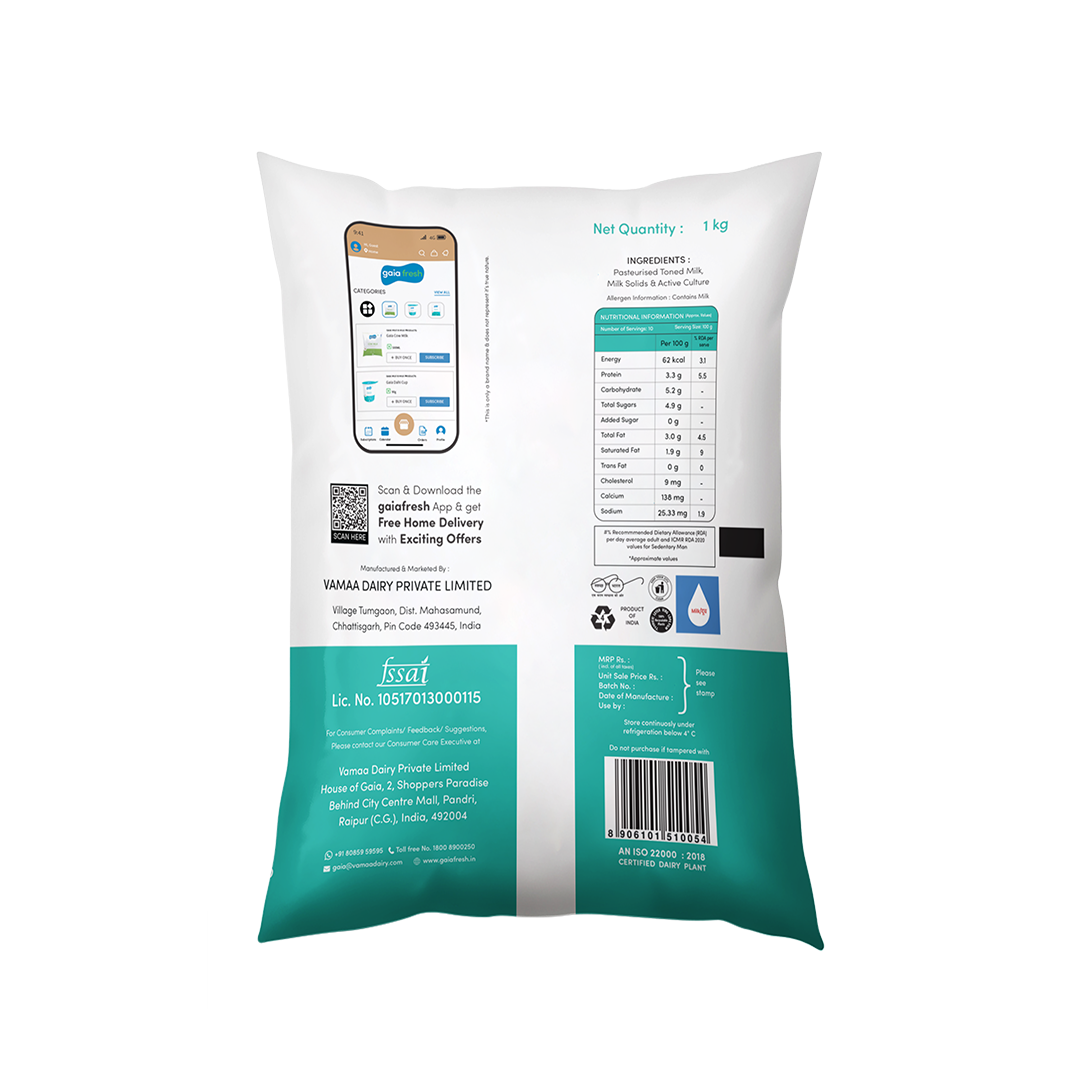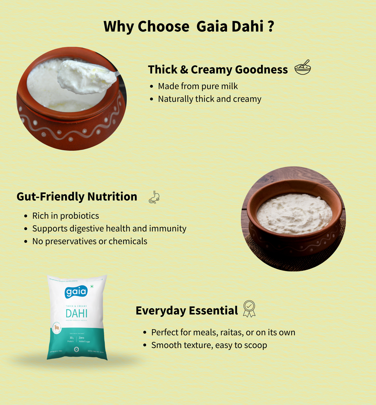 Dahi is made from pure, high-quality cow’s milk, delivering a thick, creamy texture and a naturally rich taste. Packed with probiotics, it supports digestion, boosts gut health, and strengthens immunity. Free from preservatives and artificial additives, GAIA Dahi is perfect for enjoying it on its own, mixing it into meals, or using it in various traditional recipes. It’s smooth consistency and fresh flavour make it a wholesome and nutritious addition to any diet.
