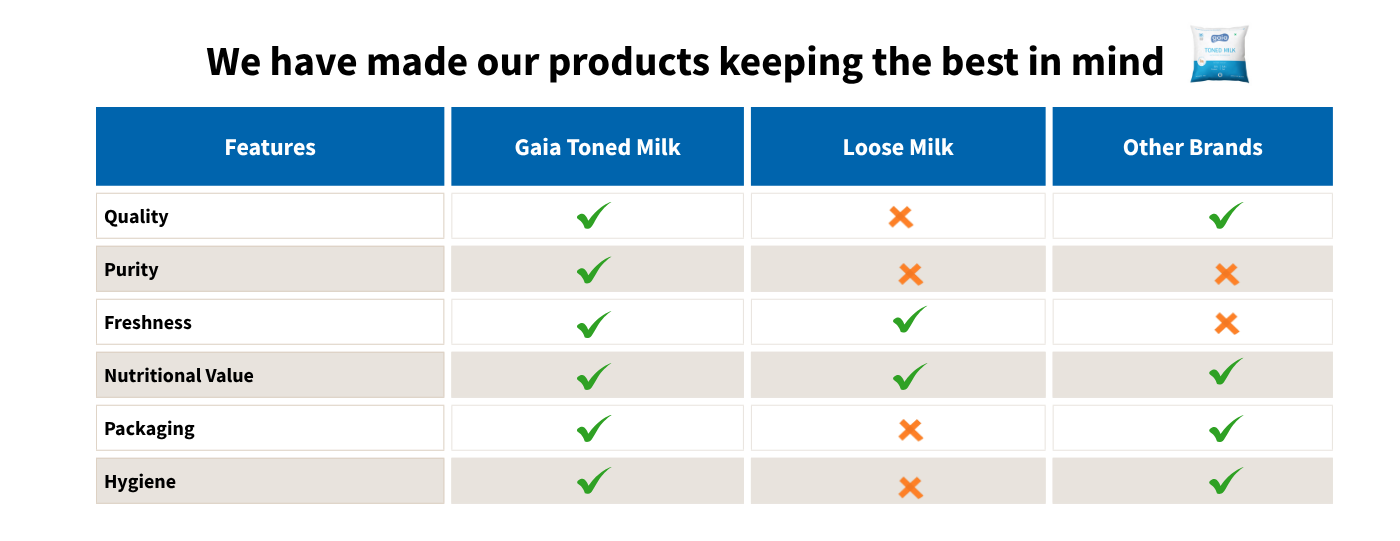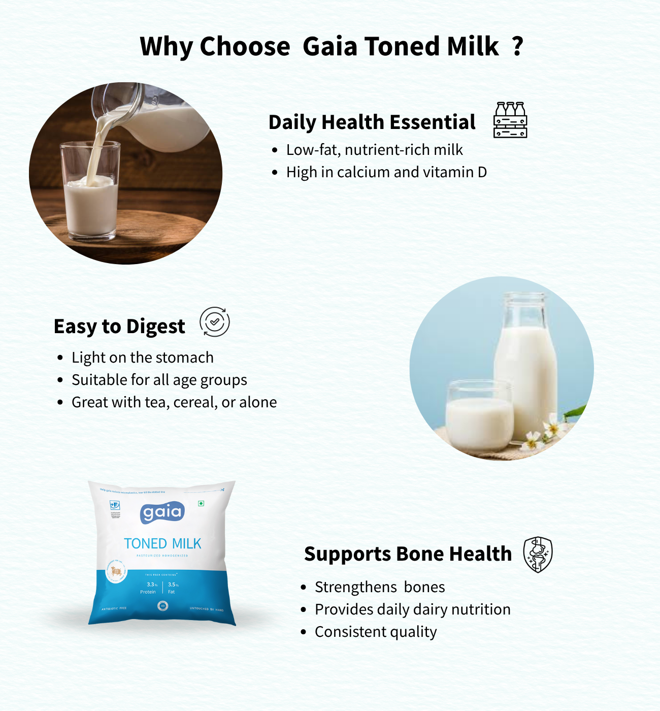 Gaia Toned Milk is a nutritious and delicious choice, crafted from pure milk using advanced processing techniques. Carefully blended with skim milk powder and water, it maintains a reduced fat content of around 3%, offering a balanced nutritional profile rich in proteins, calcium, and vitamins. Enjoy the wholesome goodness of Gaia Toned Milk – a perfect, lighter, and healthier alternative without compromising on taste.