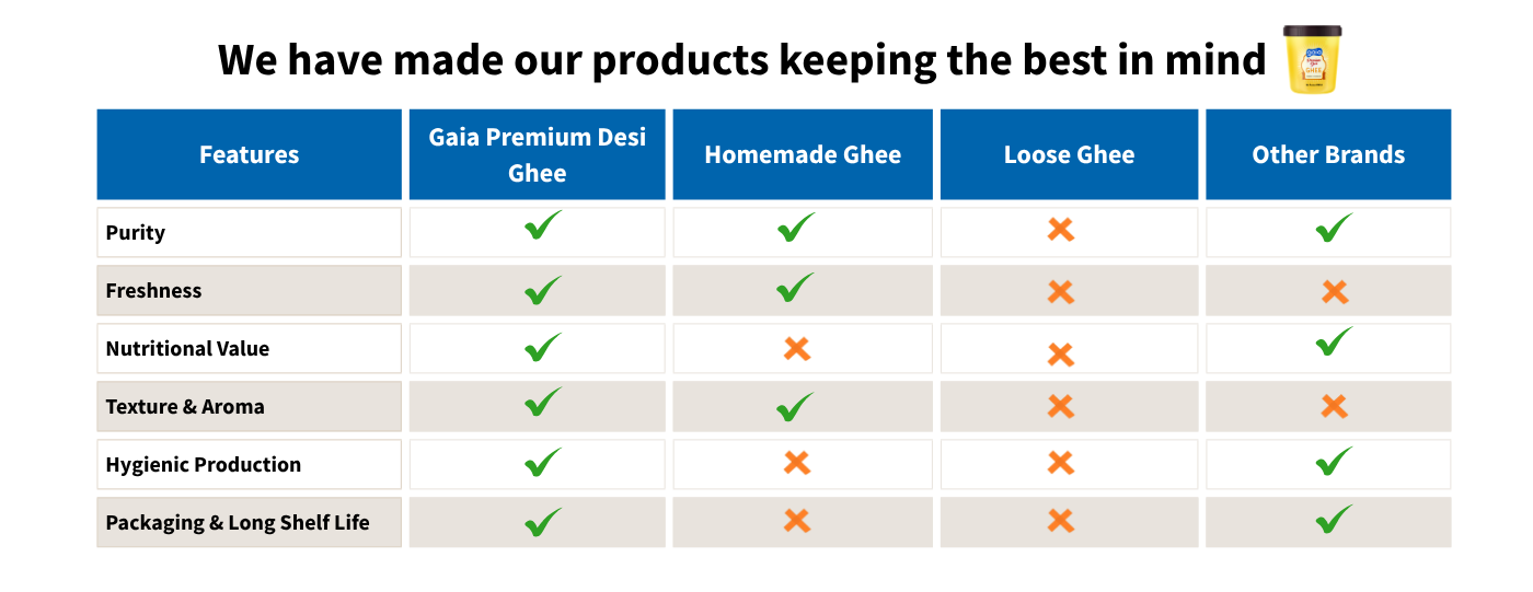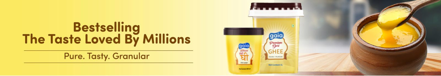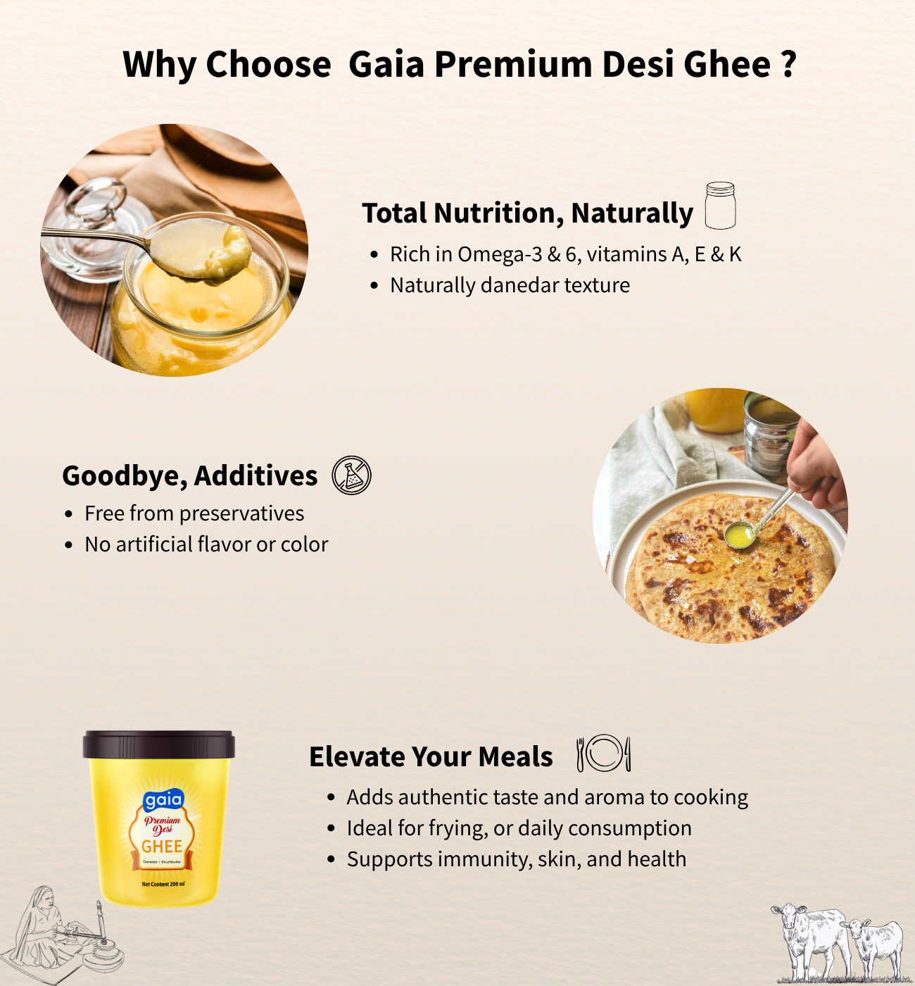 GAIA Premium Desi Ghee is crafted from pure cow’s milk using advanced processing techniques to ensure the highest quality. It features a rich, luscious texture, naturally granular (dander) consistency, and an irresistible aroma. Packed with essential nutrients, including Omega-3 and Omega-6 fatty acids and vitamins A, E, and K, it supports overall health, boosts immunity, and promotes better skin and vision. Perfect for cooking, drizzling over meals, or adding to your daily diet for authentic taste and nourishment.