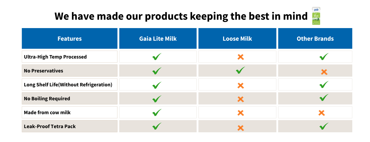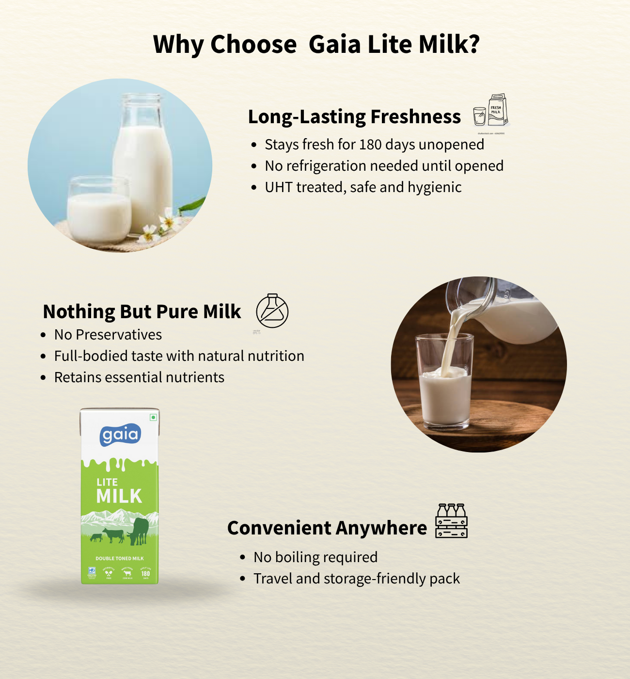LiteMilk is carefully packaged in a premium tetra pack, preserving its freshness, purity, and extended shelf life without requiring refrigeration until opened. Through Ultra-High Temperature (UHT) processing, harmful bacteria are eliminated while keeping essential nutrients intact, making it a reliable and healthy option. It contains no added water, milk powder, preservatives, or chemicals, providing the full, natural taste of fresh milk. The easy-to-carry, leak-proof packaging makes it ideal for travel. No need to boil—just open and enjoy. Once opened, store in the refrigerator and consume within two days.